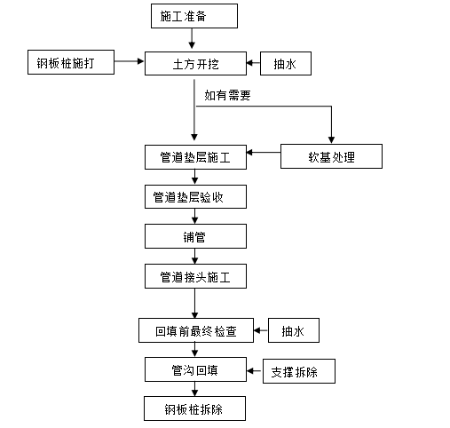 排水工程施工顺序:测量放线——管沟开挖——沟壁的支撑管基填筑——雨污管道安装——雨污水检查井的砌筑——管沟分层回填夯实。